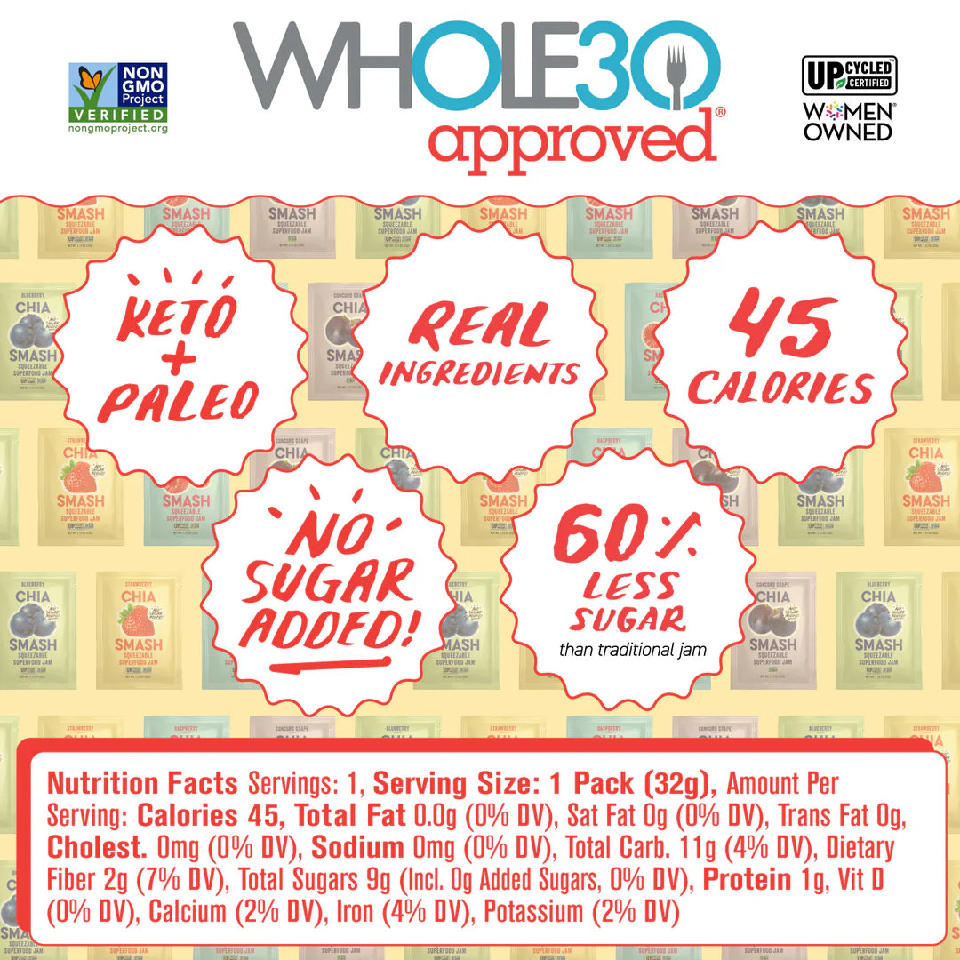 Chia Smash is the only jam that is Whole 30 approved with zero added sugar, fake sweeteners, or preservatives.